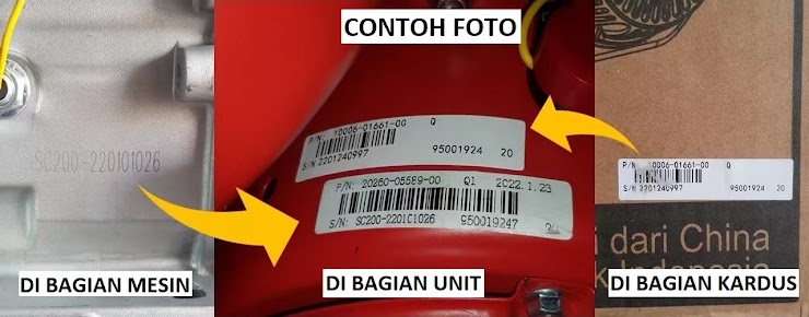 Kode mesin (foto kiri), 2 barcode kode unit (foto tengah) dan bercode unit (foto kanan)
